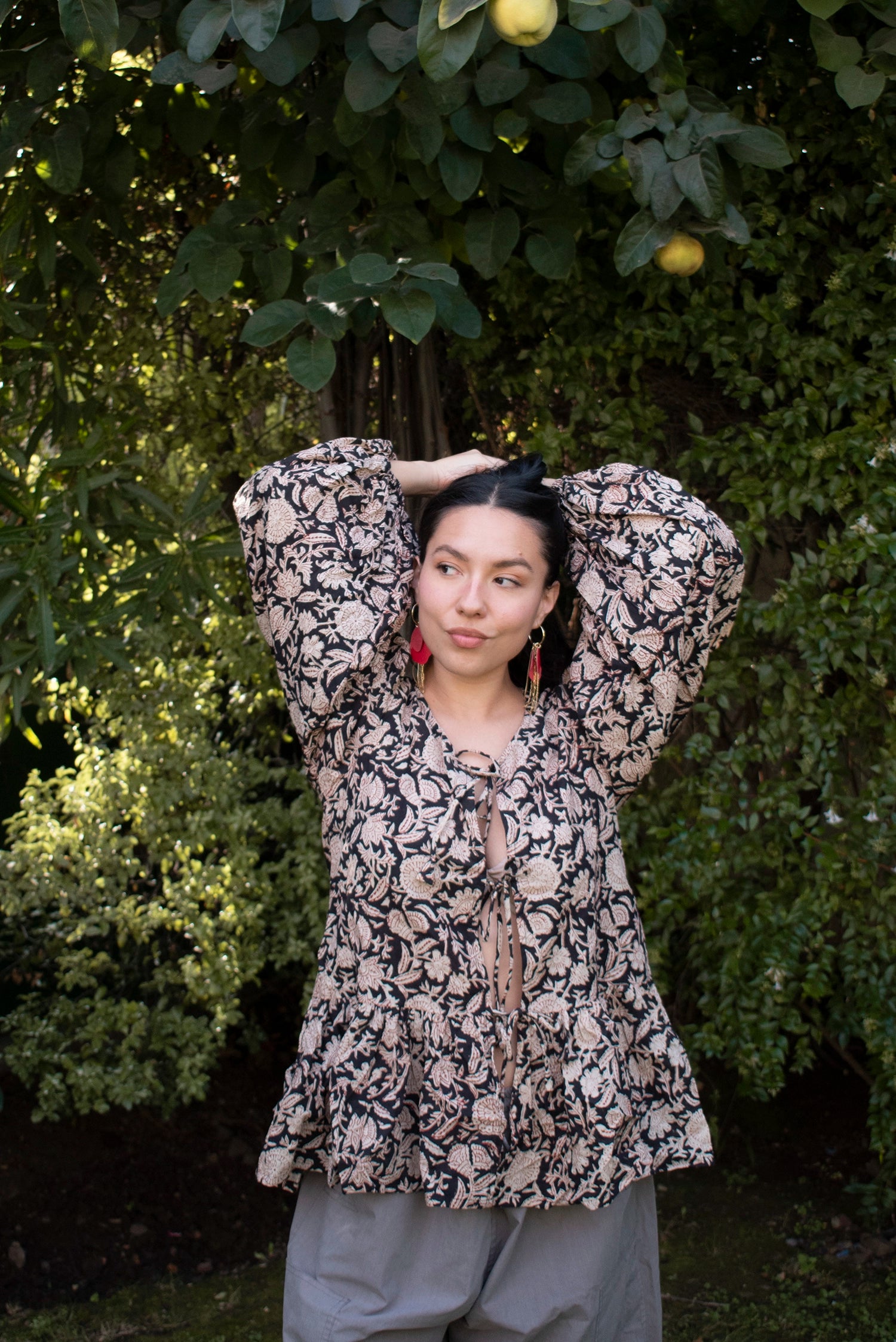 - Blusa de manga larga con lazos.