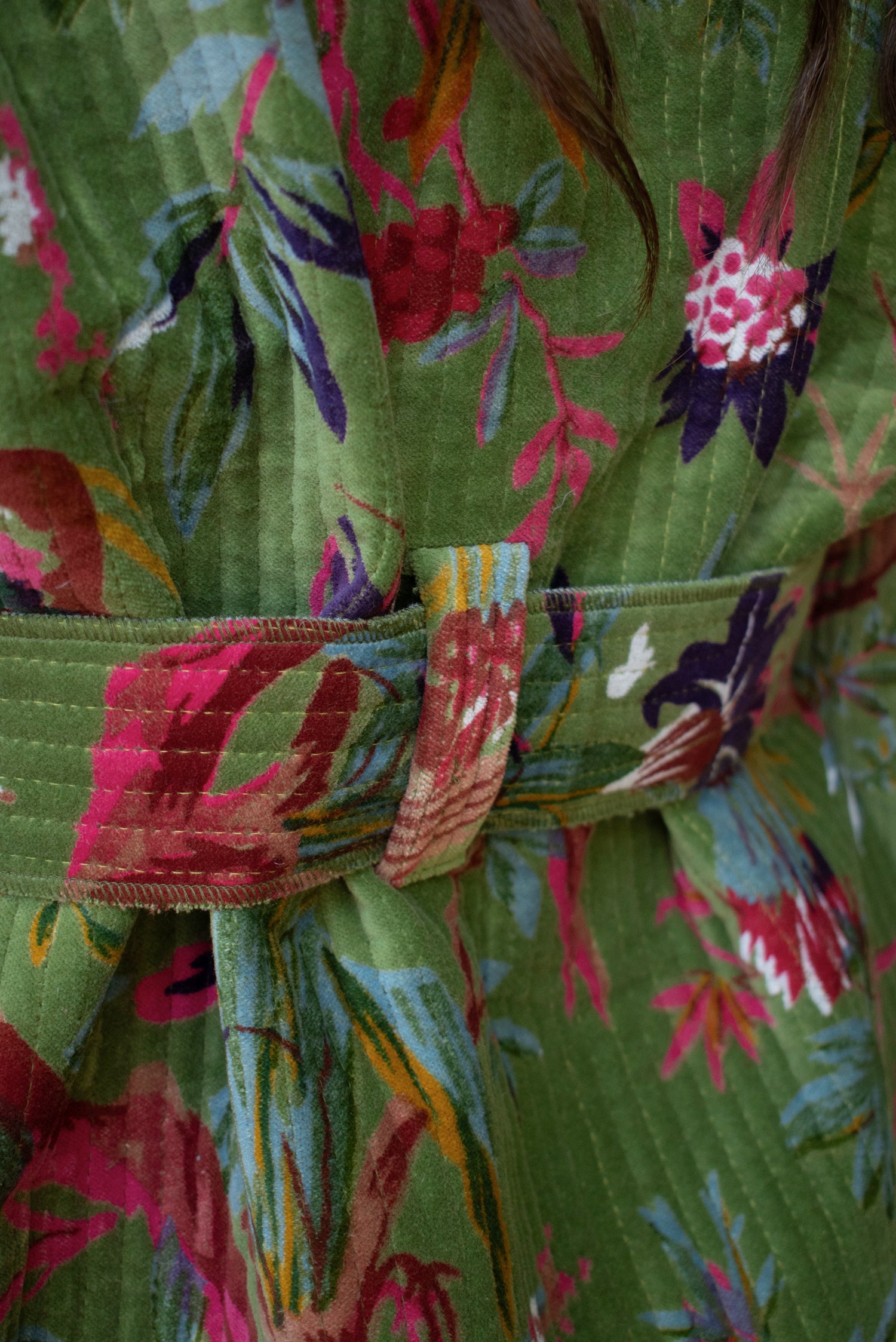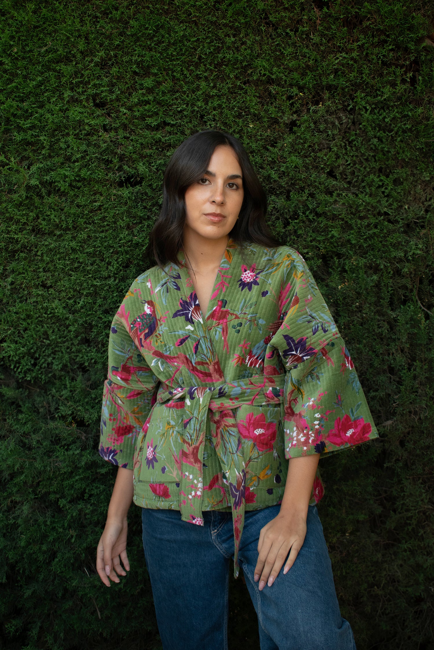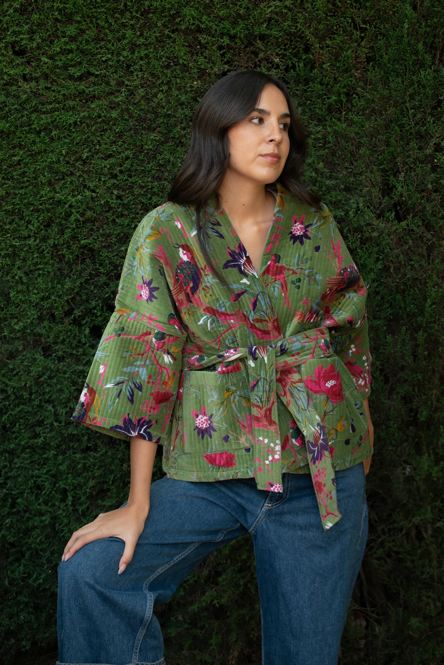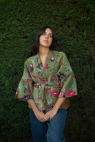 Kimono corto de algodón 100%. Exterior en terciopelo (velvet) de algodón con serigrafía (screen printing) y forro interior estampado con blockprint. Con bolsillos y lazo opcional. Talla única. Hecho en nuestro taller asociado en India.