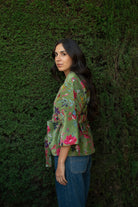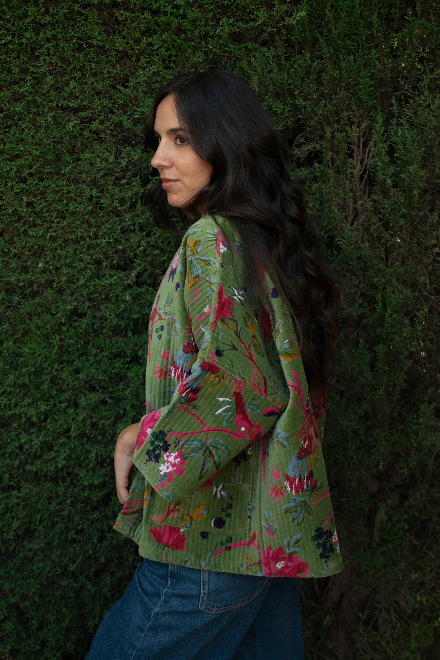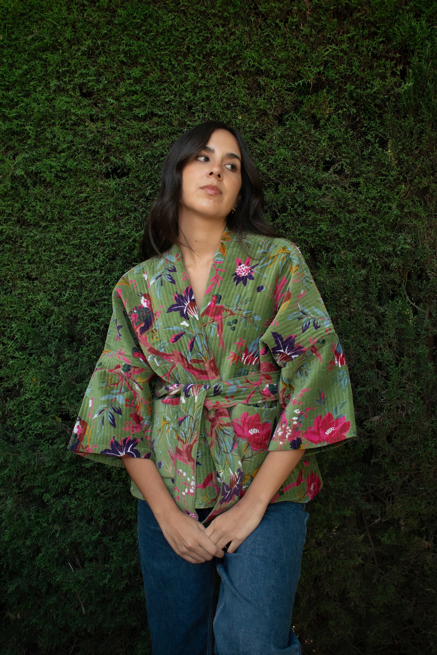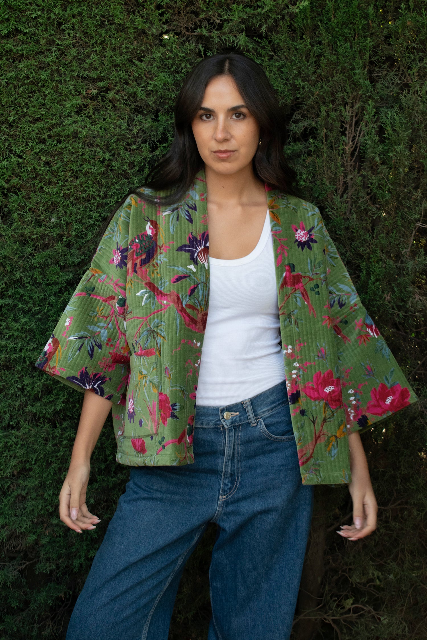Kimono corto de algodón 100%. Exterior en terciopelo (velvet) de algodón con serigrafía (screen printing) y forro interior estampado con blockprint. Con bolsillos y lazo opcional. Talla única. Hecho en nuestro taller asociado en India.