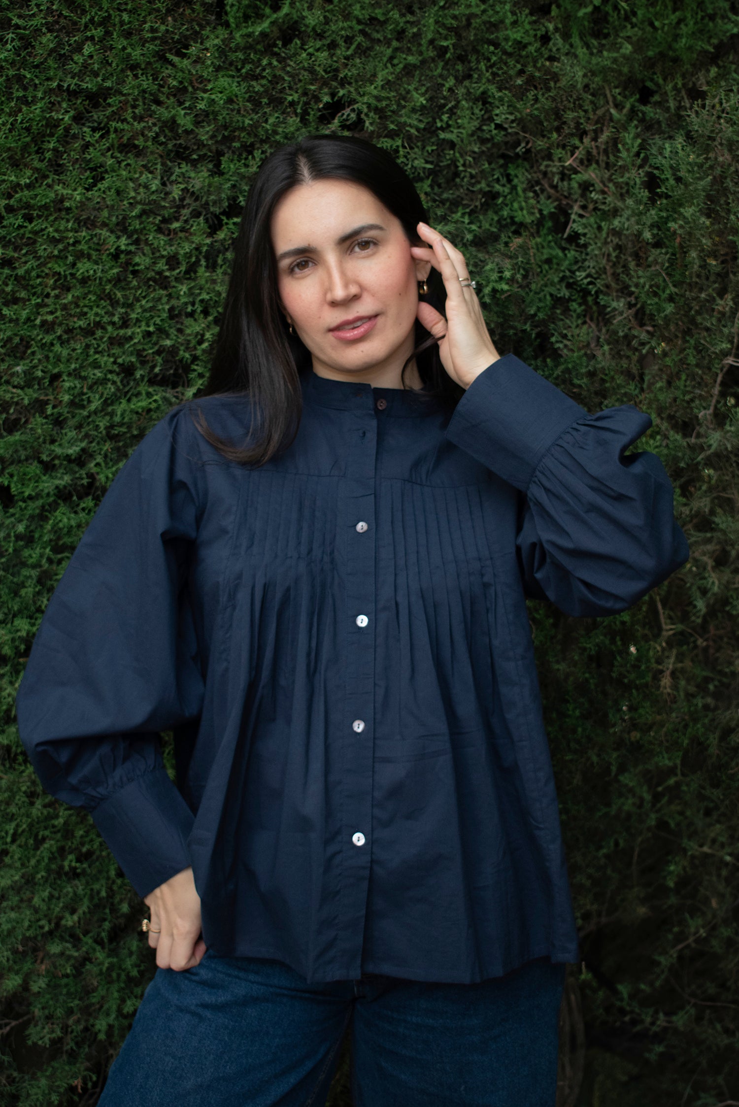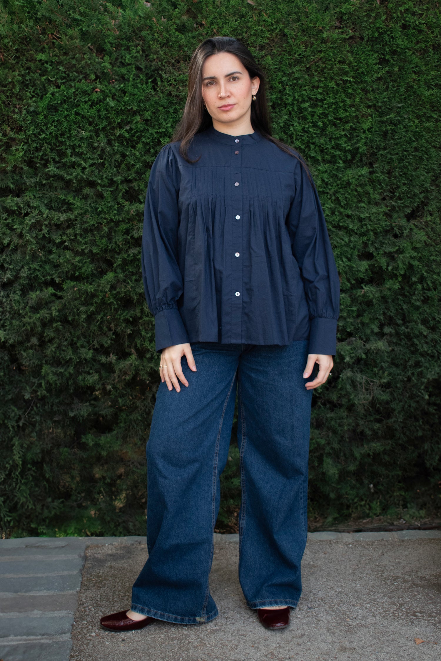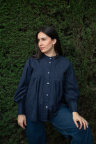 Mangas largas abullonadas con puño y botones. Tiene pliegues en delantero y espalda para un volumen sutil y elegante. Hecha en nuestro taller asociado en India.