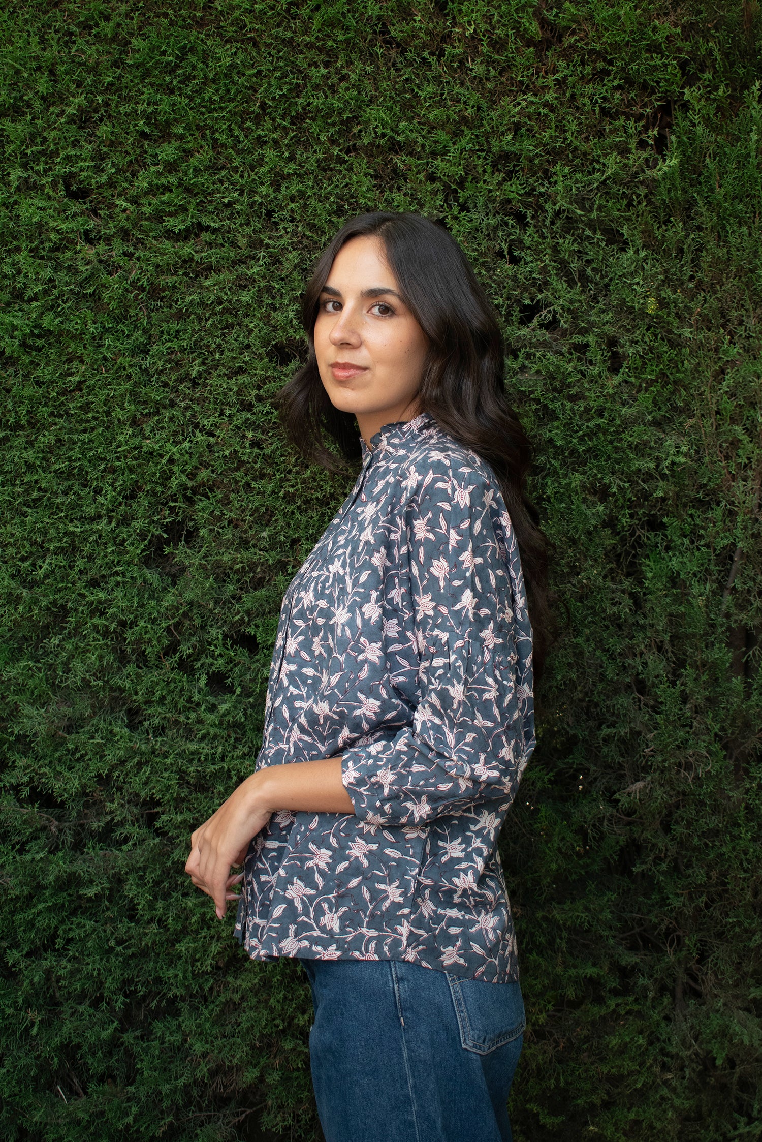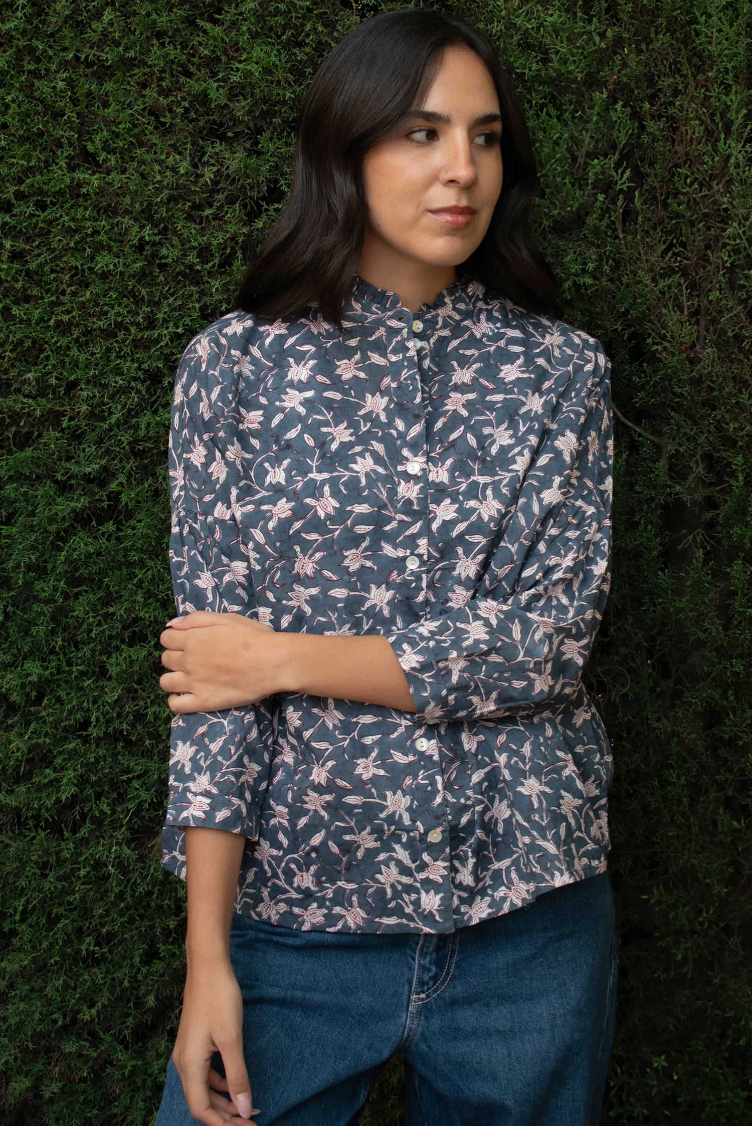 Cuello mandarín con mini ruffles y mangas 3/4 con pliegues que dan un volumen sutil. Confeccionada en nuestro taller asociado en India.